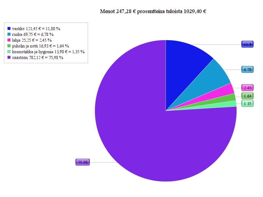 Tulot 1029,40 - menot 247,28 = 782,12 € säästöön. Säästöprosentti 75,98.